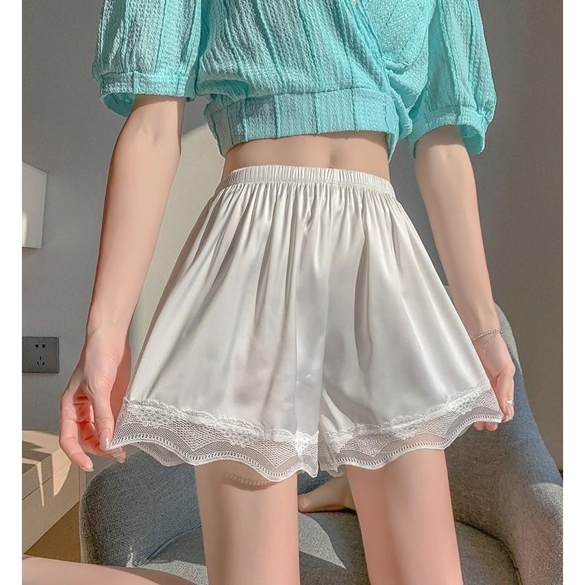 กางเกงขาสั้นผู้หญิง กางเกงใส่นอน กางเกงผ้าซาติน ปลายขาแต่งลูกไม้ เอวยืดได้เยอะ ผ้านิ่ม บางเบา สวมใส่สบาย