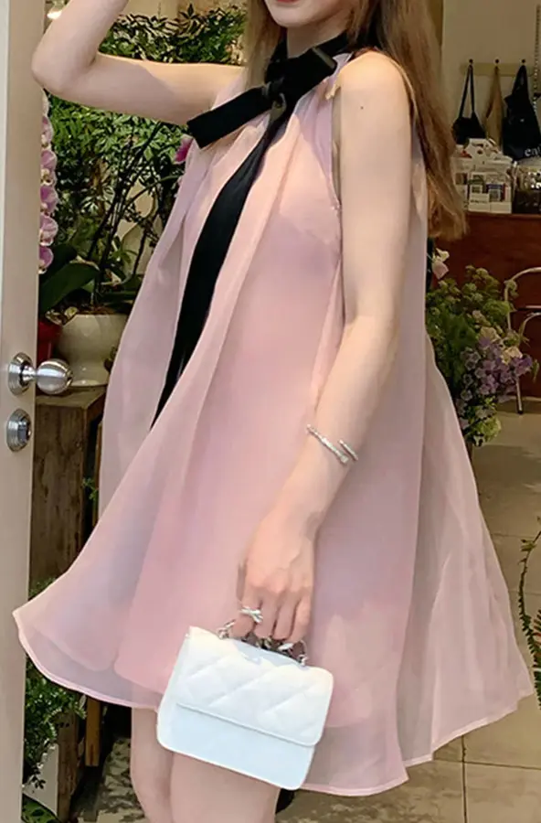 ชุดเดรสคอปกผูกโบว์ด้านหน้าแบบเรียบง่าย 2 ชั้น